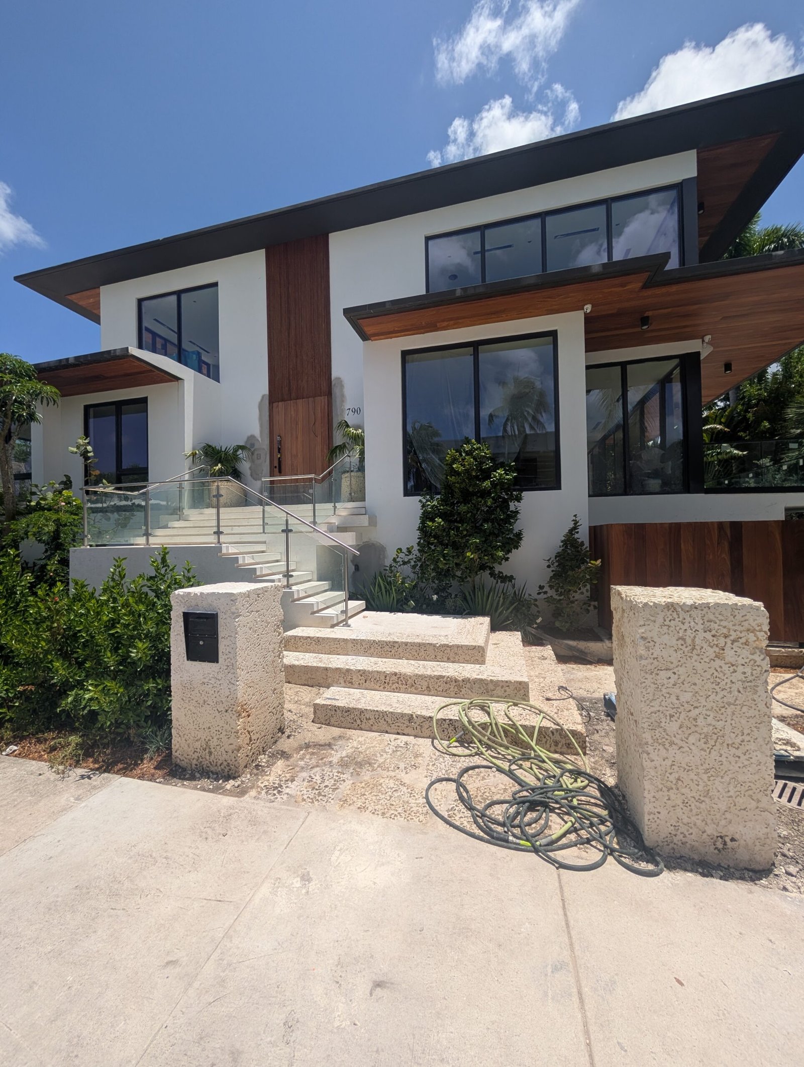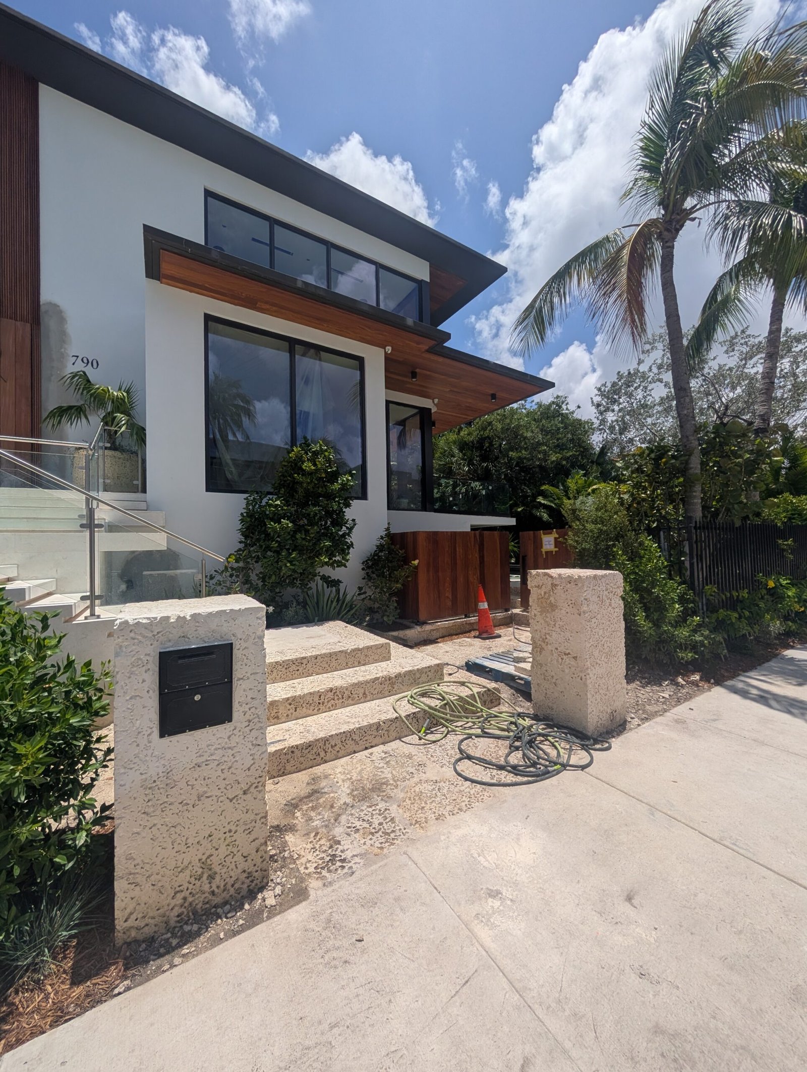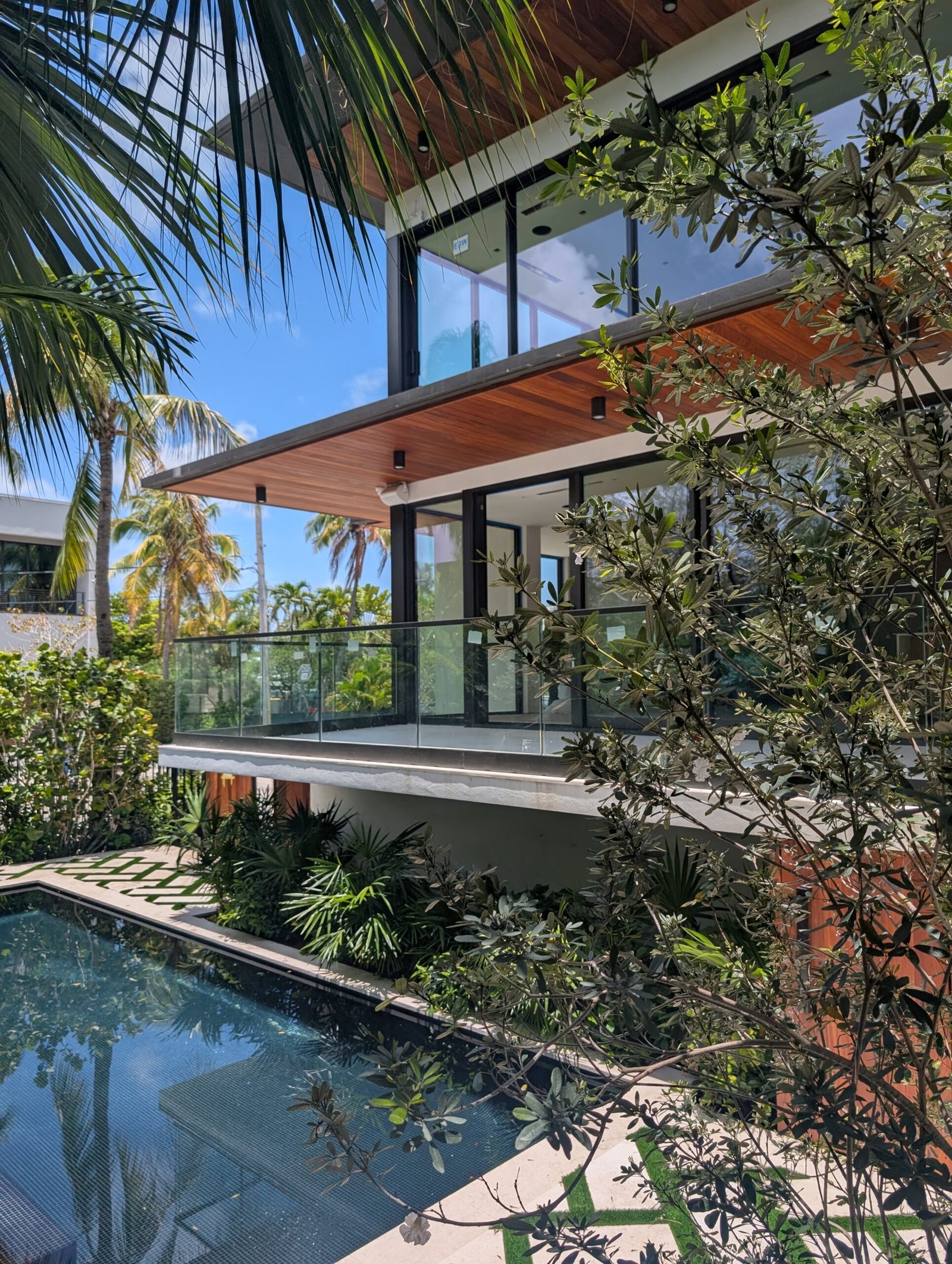 The architecture is modern, yes—but warm. We used materials that echo the textures of old Miami: coral rock, warm teak, oolite, and polished concrete that catches the sun like wet stone. The façade is a rhythm of planes—some solid, some louvered for airflow, some glass that disappears into pocketed frames. A cantilevered overhang shades the upper floor, balancing elegance with function in the relentless Florida sun.