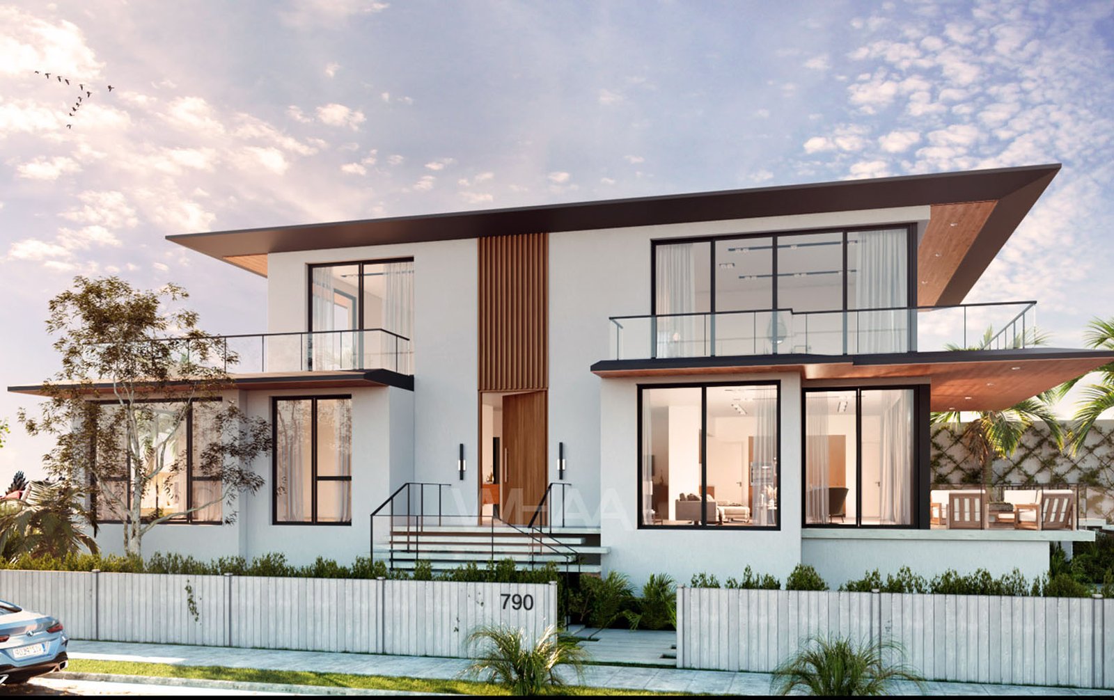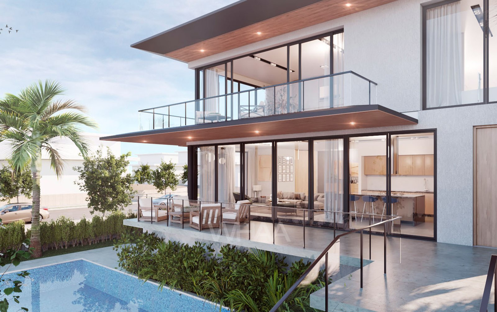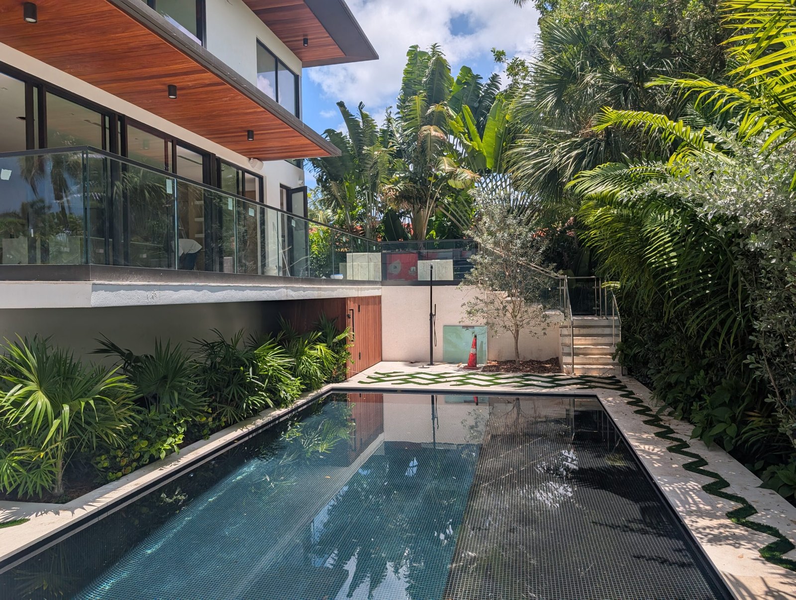 The architecture is modern, yes—but warm. We used materials that echo the textures of old Miami: coral rock, warm teak, oolite, and polished concrete that catches the sun like wet stone. The façade is a rhythm of planes—some solid, some louvered for airflow, some glass that disappears into pocketed frames. A cantilevered overhang shades the upper floor, balancing elegance with function in the relentless Florida sun.